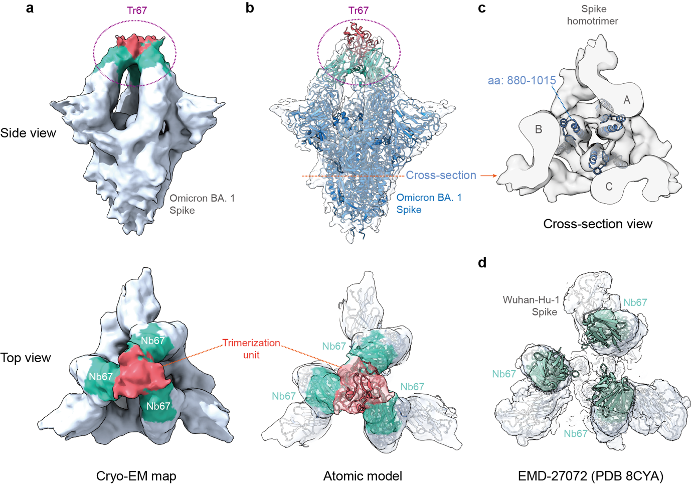 图 3. 纳米抗体束Tr67结合Omicron病毒S蛋白的“3-RBD-up”构象。