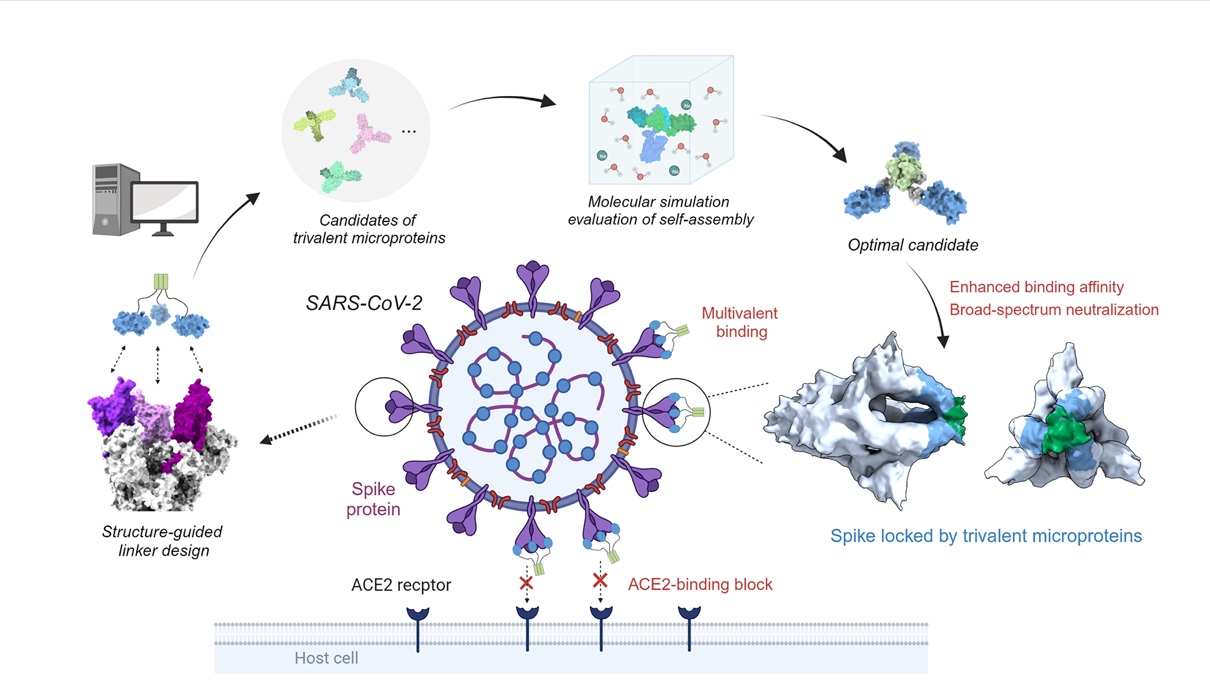 新冠疫情的高峰期虽已过去,但新冠病毒还在持续变异,产生能逃避免疫系统的新变种,使现有疫苗和抗病毒药物,特别是中和抗体蛋白药物失效。抗病毒蛋白药物通常基于人体在病毒感染或疫苗免疫时产生的天然抗体开发而成,它们主要识别并结合病毒表面的刺突(简称S) 蛋白的受体结合域 (简称RBD),阻止病毒与人宿主细胞的ACE2受体结合,进而抑制病毒入侵和复制。然而,变异病毒RBD区域的氨基酸突变削弱了蛋白药物的结合能力,使其无法有效阻断病毒与宿主细胞的结合。例如,Omicron变异株的突变使得许多早期抗体药物失效。因此,对天然抗体蛋白进行改良,人工设计出能够中和多种变异病毒的广谱性蛋白药物显得尤为重要。