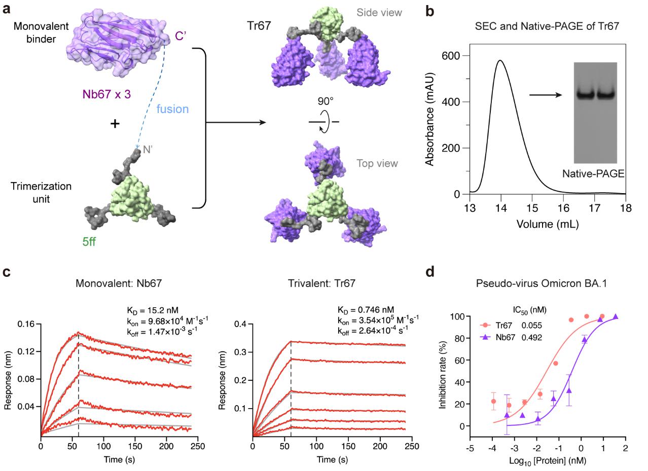 在此基础上,以纳米抗体Nb67为RBD的单价结合剂,应用MP-5ff的三聚化支架和连接子,构建了自组装特性同样优良的三价纳米抗体束Tr67 (图2)。Tr67展现出了比Nb67更强的结合亲和力,具有广谱的抗病毒活性。假病毒中和实验表明,Tr67能够有效抑制Omicron病毒的主要变异株,包括纳米抗体Nb67无法中和的变异株,以及对现有抗体逃逸性最强的XBB.1和XBB.1.5变异株。