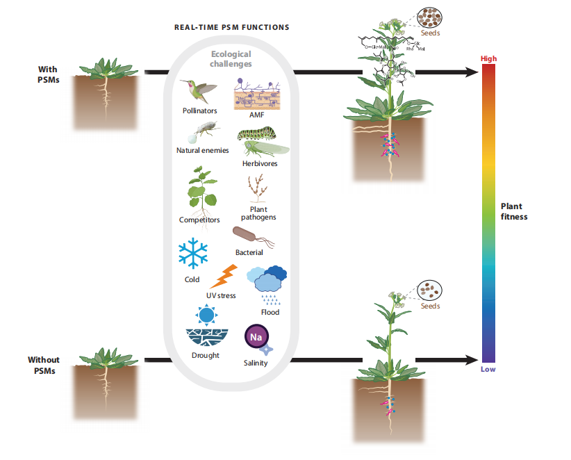 植物次生代谢物功能的最初研究源于有机化学家和研究昆虫的生物学家之间的合作,这些昆虫的防御和信息素化学特性相对简单,通常是在特定器官以高浓度产生的简单化学结构。随着研究领域扩展至植物更具挑战性的化学物质,分析化学家和分子生物学家加入了这一合作。尽管有机化学家贡献了合成的PSMs,但这些PSMs通常过于微量或不稳定,无法从植物中直接提纯,并面临实现PSMs多个手性中心的准确性挑战。分子生物学家提供创造无PSMs植物的手段,而生物学家利用这些工具进行功能测试,通常通过实验室生物测定,并通过自然历史观察进一步验证功能假设。这种方法为次生代谢物功能提供了客观的分析视角,通过观察植物与天敌、病原体、益生微生物、传粉者、天敌及竞争者等自然群落的相互作用,提出并验证功能假设(见图1)。