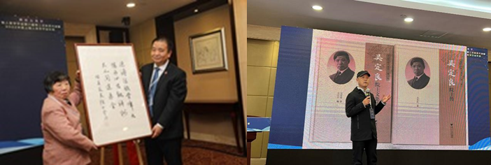为纪念中国生物人类学奠基人吴定良先生,学术年会伊始,首先举办了“《吴定良院士传》新书发布会”,吴定良院士的小女吴小庄女士和金力院士共同为新书揭幕;作为复旦百年人类学丛书的第一辑,李辉常务副会长介绍了该书的精彩内容;金力院士把“颂吴定良院士”的书法题字赠送给了吴小庄女士: