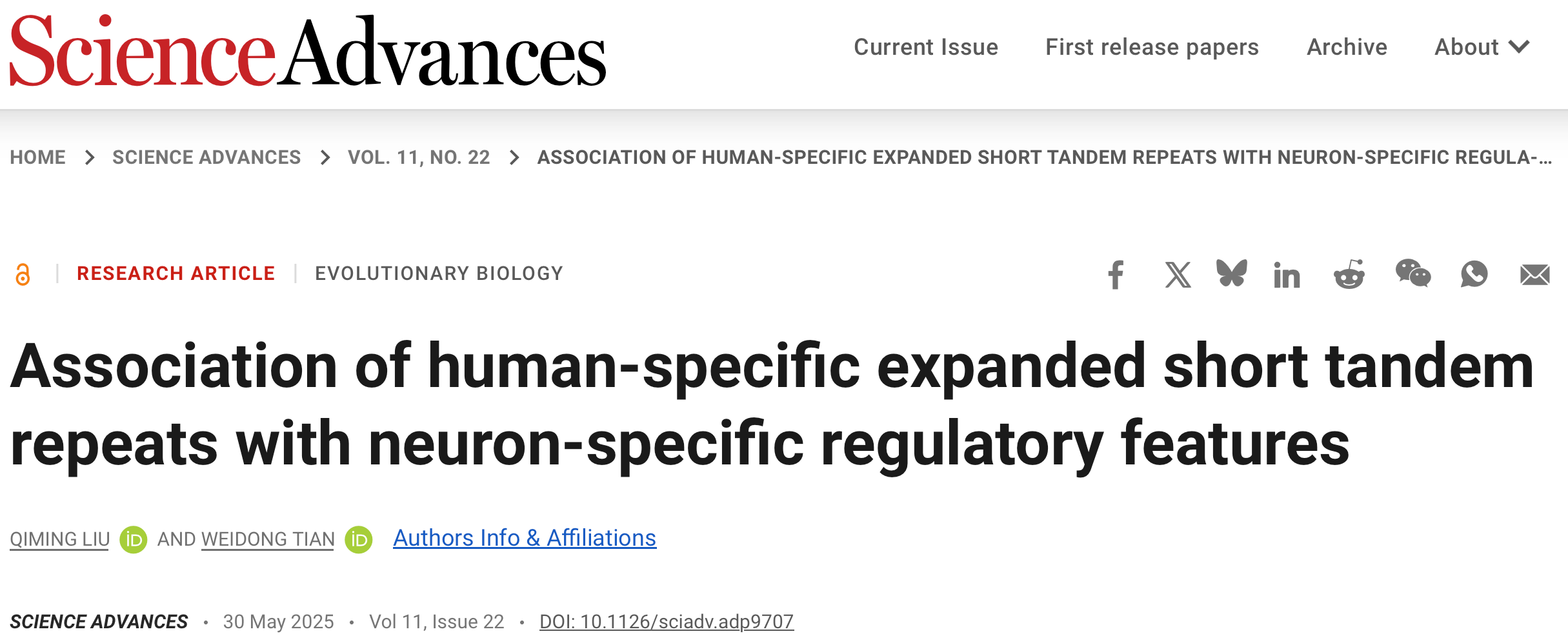 2025年5月30日,国产无码 田卫东教授团队在Science Advances发表题为Association of human-specific expanded short tandem repeats with neuron-specific regulatory features的研究论文。该研究首次系统性地鉴定了8813个人类特异性扩增的短串联重复序列(heSTRs),并揭示了它们在神经元特异性调控中的重要作用,为理解人类大脑进化机制和神经发育疾病的遗传基础提供了全新视角。