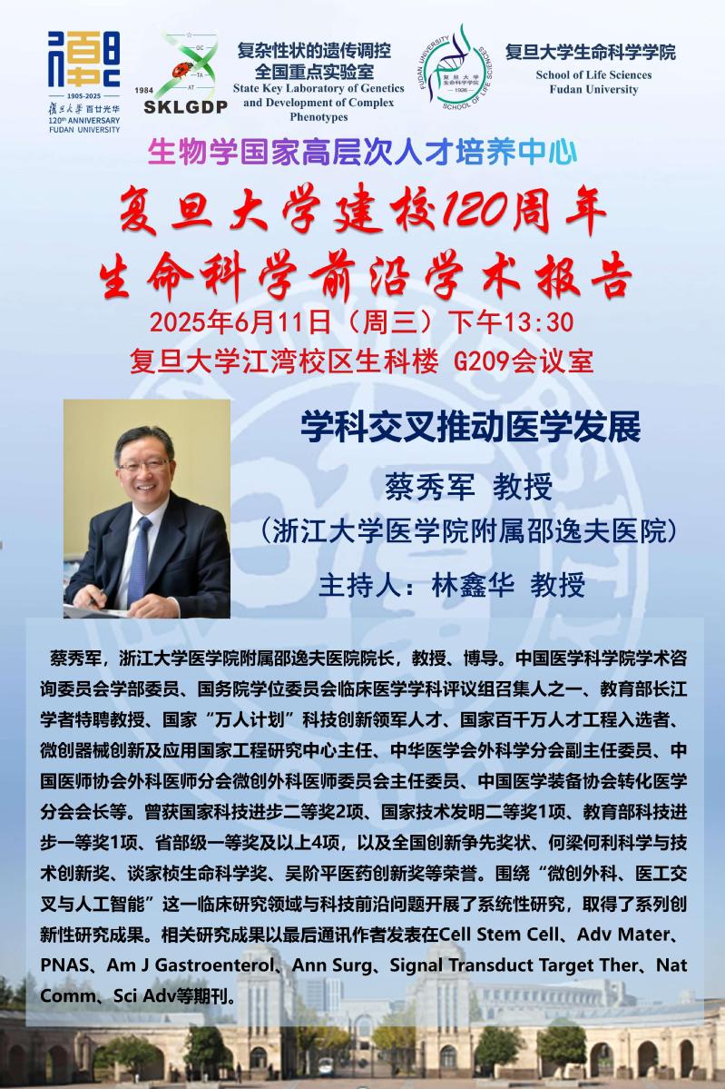 生命科学前沿学术报告-2025-06-11(周三) 13:30,蔡秀军 教授(浙江大学医国产无码附属邵逸夫医院)