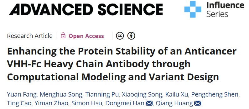 Y. Fang, M. Song, T. Pu, X. Song, K. Xu, P. Shen, T. Cao, Y. Zhao, S. Hsu, D. Han*, Q. Huang*. Enhancing the Protein Stability of an Anticancer VHH-Fc Heavy Chain Antibody through Computational Modeling and Variant Design. Advanced Science. 2025.