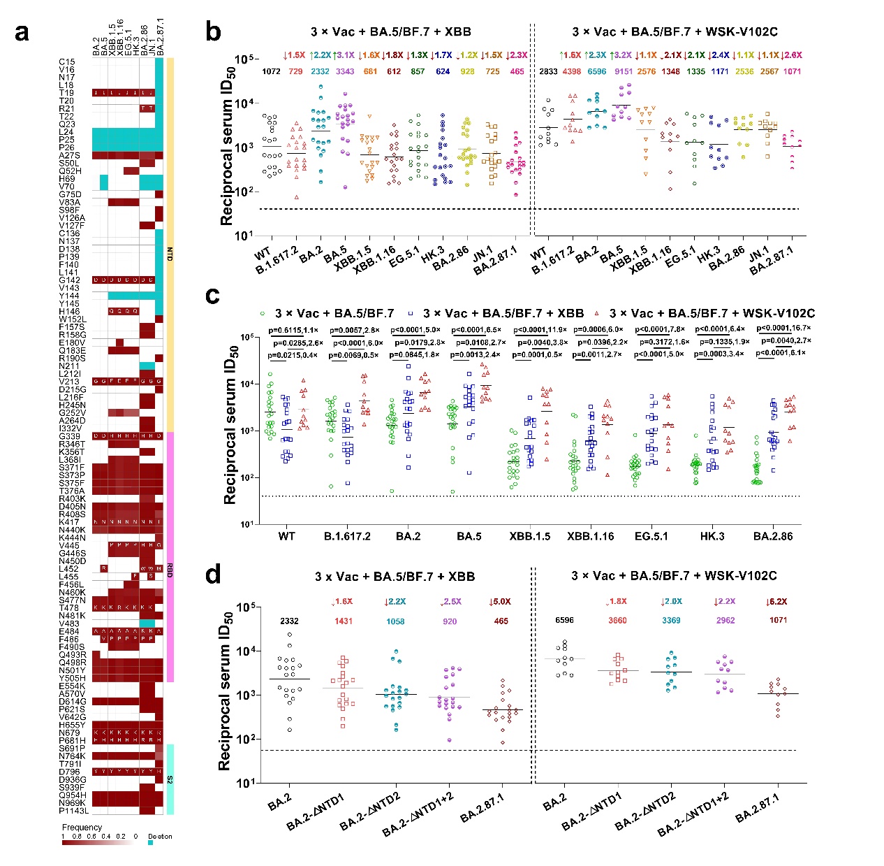 在这项研究中,研究人员招募了两组在接种三剂灭活新冠疫苗后出现 BA.5/BF.7 突破性感染的参与者:其中一组接种了威斯克3价XBB疫苗,而对照组则在随后经历了XBB毒株感染。研究者对参与者的血清中和抗体活性进行的比较分析表明:针对高度逃逸性的JN.1、BA.2.86、BA.2.87.1(起源于南非,近期已被世界卫生组织(WHO)列为需要监测的毒株)和BA.5变异株,接种威斯克3价XBB疫苗组可产生高水平的中和抗体滴度(GMT)分别为2567、2536、1071和9151,而XBB毒株感染组产生的中和抗体GMT分别只有725、928、465和3343。研究发现威斯克的三价疫苗能够诱导比XBB再感染更高更广的中和抗体水平,提示更新的含最新成分的多价疫苗对变异株具有更好的免疫反应。研究还完成了对新冠病毒最近备受关注的BA.2.87.1的评估,发现其NTD两个大的缺失对其逃逸有明显贡献