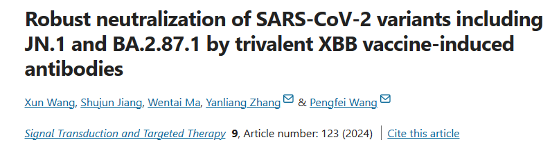 2024年5月9日,国产无码 王鹏飞联合南京市中医院于国际权威杂志Signal Transduction and Targeted Therapy在线发表题为“Robust neutralization of SARS-CoV-2 variants including JN.1 and BA.2.87.1 by trivalent XBB vaccine-induced antibodies”的论文,研究显示威斯克3价XBB疫苗针对多种新冠变异株比XBB突破感染者诱导了更强的中和抗体反应,可有效对抗广泛的新冠病毒变异株。