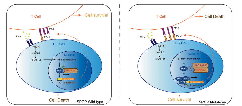 本研究确定了SPOP作为IRF1-PD-L1轴的负调控因子,并描述了IRF1和PD-L1在SPOP突变驱动的内膜癌免疫逃避中的关键作用。另外,检测SPOP突变状态可能有助于识别对PD-1/PD-L1阻断免疫治疗有响应的内膜癌病人群体。