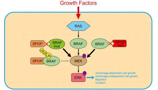 图一、SPOP介导的BRAF泛素化修饰调控MAPK-ERK信号通路模式图