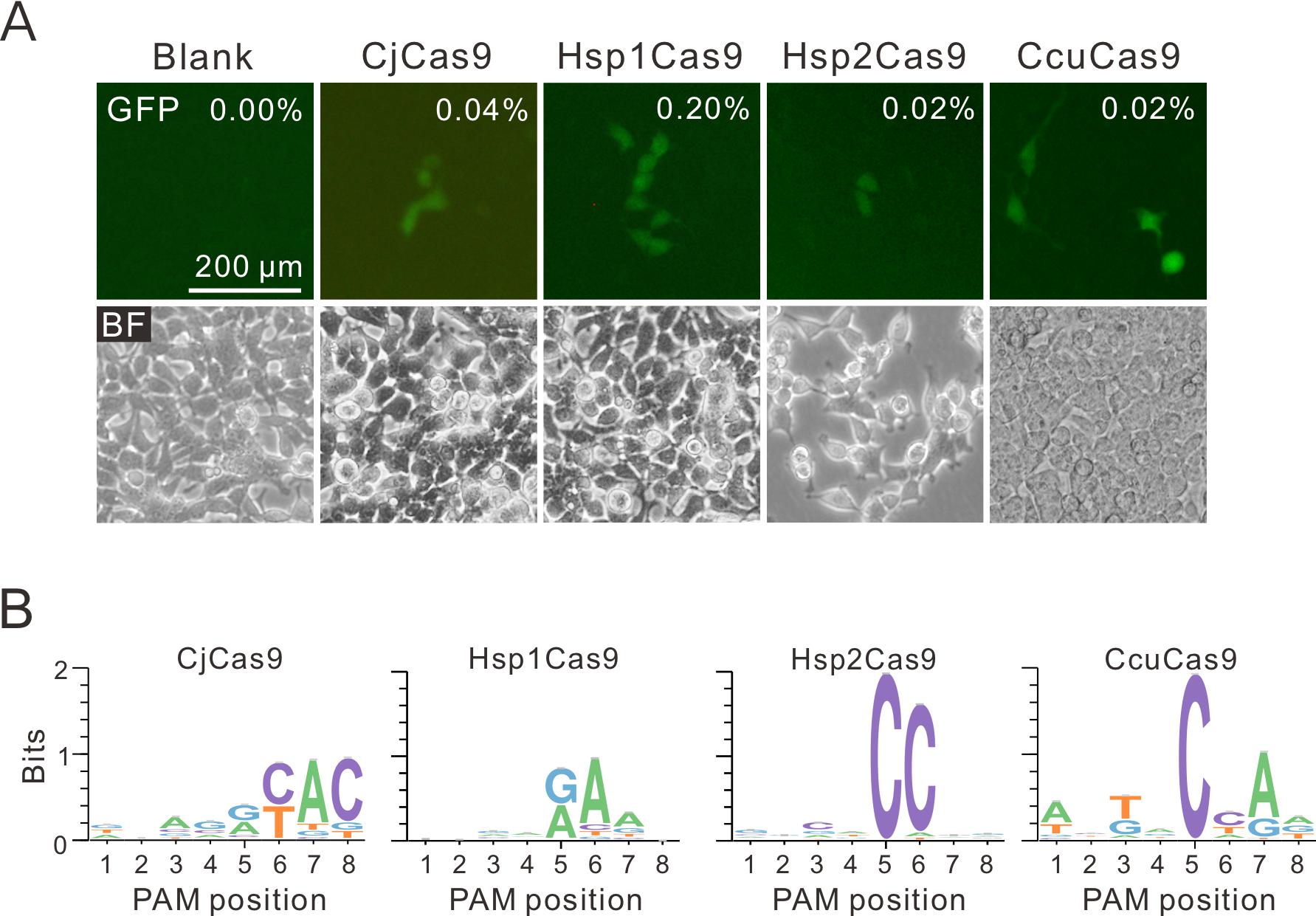 作者通过对CjCas9同源蛋白的筛选,鉴定到3种天然的基因编辑工具(Hsp1Cas9、Hsp2Cas9、CcuCas9),其PAM分别为N4RAA、 N4CC和N4CNA,扩大了基因编辑应用范围(图2)。