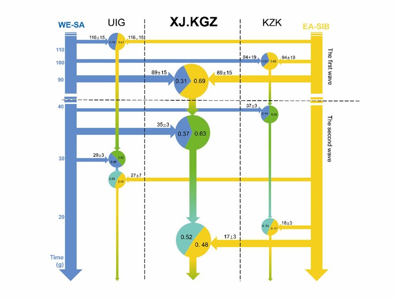 研究显示,现代柯尔克孜族的基因库主要由东亚(41.7%)、西伯利亚(25.6%)、西欧亚(25.2%)和南亚(7.6%)四大祖先成分构成(图1)。通过重构“双重混合模型”推断,柯尔克孜族的基因融合可分为两个关键阶段(图2):第一次混合(约2225年前):可能在战国至秦朝时期,东西方人群发生接触促成了早期基因交流;第二次混合(约875-425年前):蒙古帝国扩张及后续历史事件推动了新一轮混合,可能与蒙古统治下的族群迁徙密切相关。