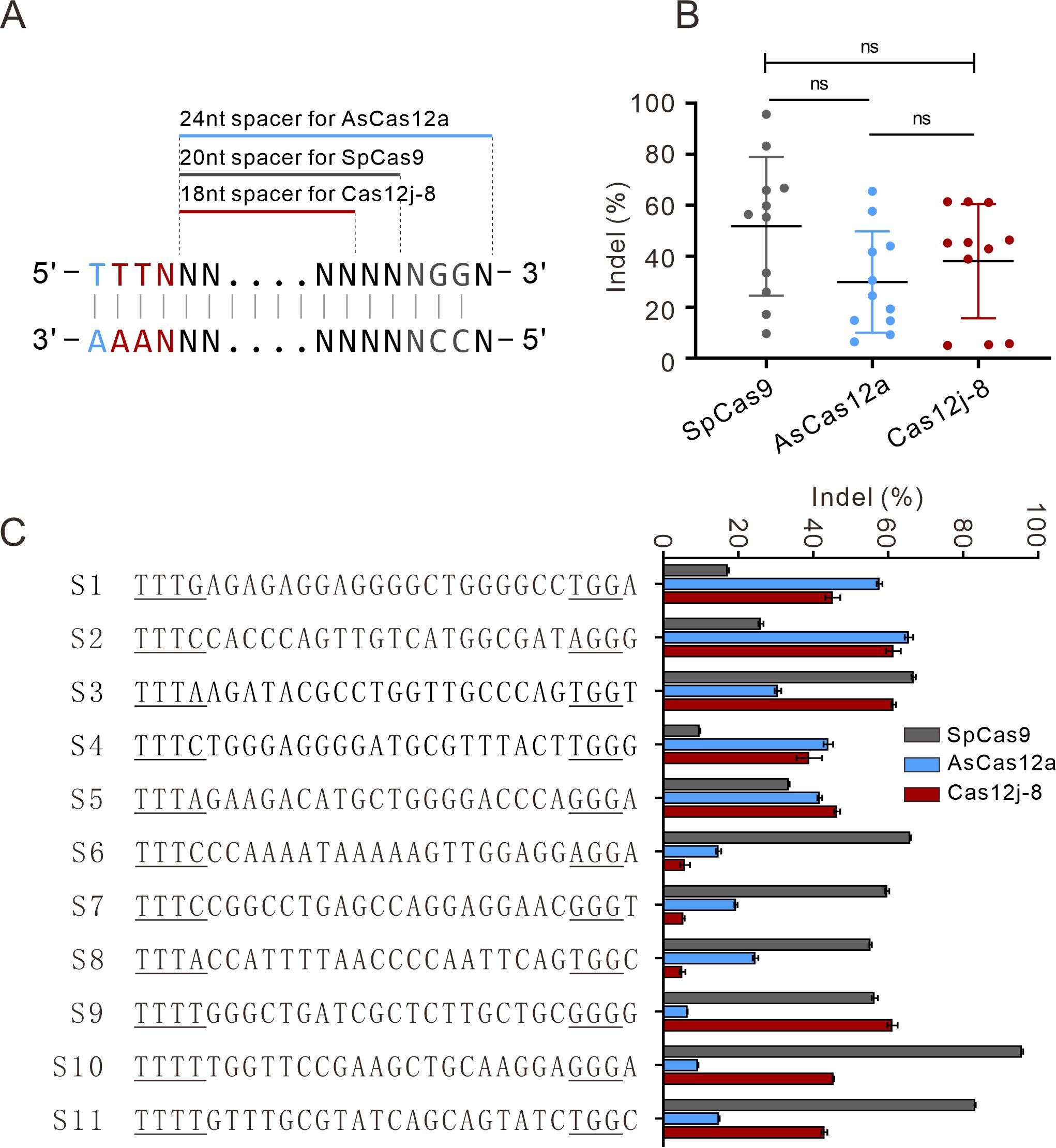 作者随后比较了Cas12j-8、SpCas9、AsCas12a的编辑活性。在11个测试位点中,Cas12j-8编辑活性比SpCas9略低,比AsCas12a高(图2)。