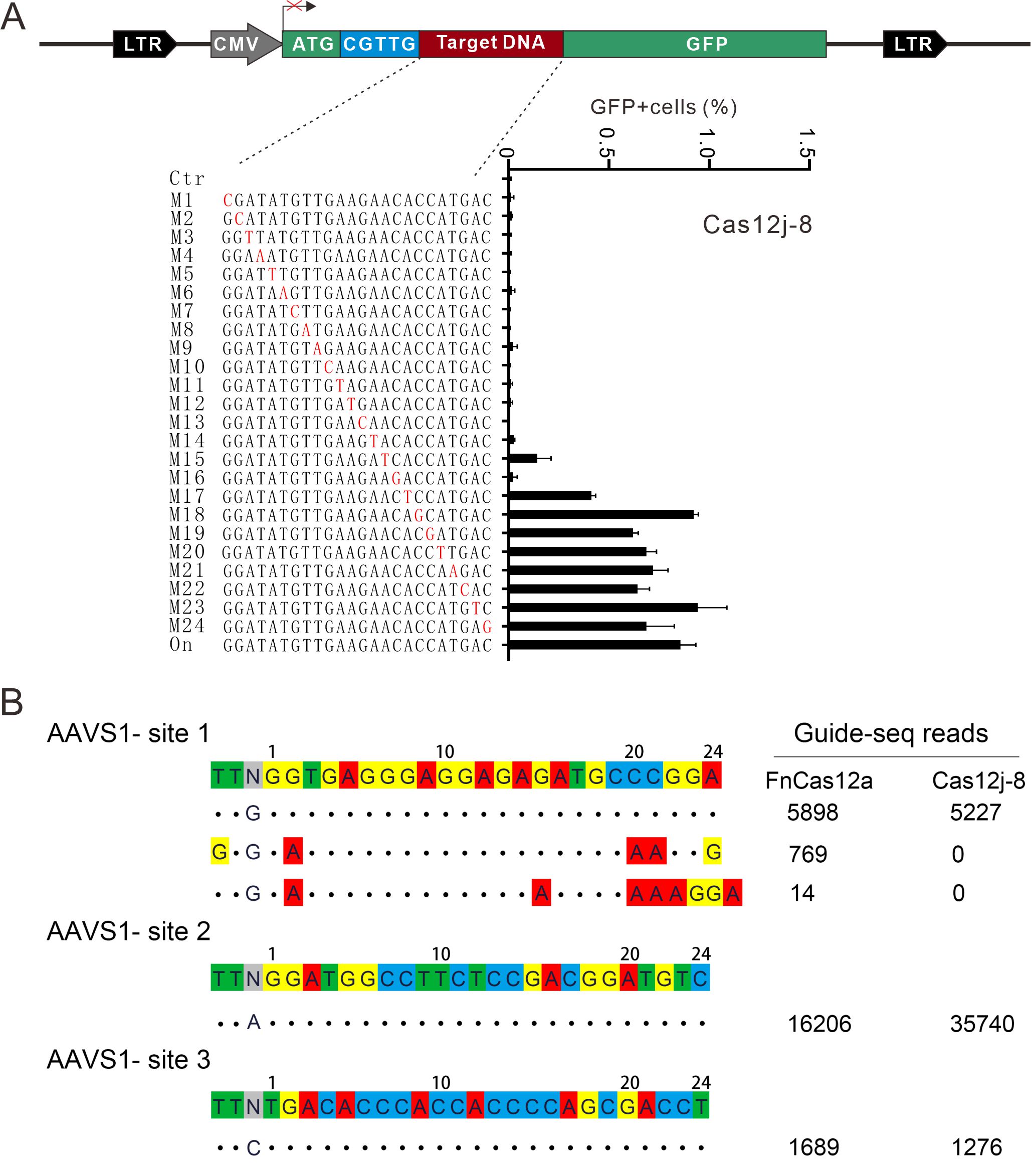 作者又分析了Cas12j-8的特异性。利用GFP激活表达系统测试特异性。GFP含有一个插入片段,造成移码突变。对插入片段进行编辑,产生indel,会在一部分细胞中产生整码突变,GFP得以表达。设计一系列含有单碱基的crRNA靶向GFP,发现Cas12j-8特异性极高,在sgRNA1-14位不能容忍单碱基错配(图3A)。利用全基因组脱靶分析技术(GUIDE-seq)分析3个crRNA的脱靶情况,未发现脱靶(图3B),说明该Cas12j-8特异性极高。FnCas9作为对照,在一个位点检测到了两个脱靶位点。