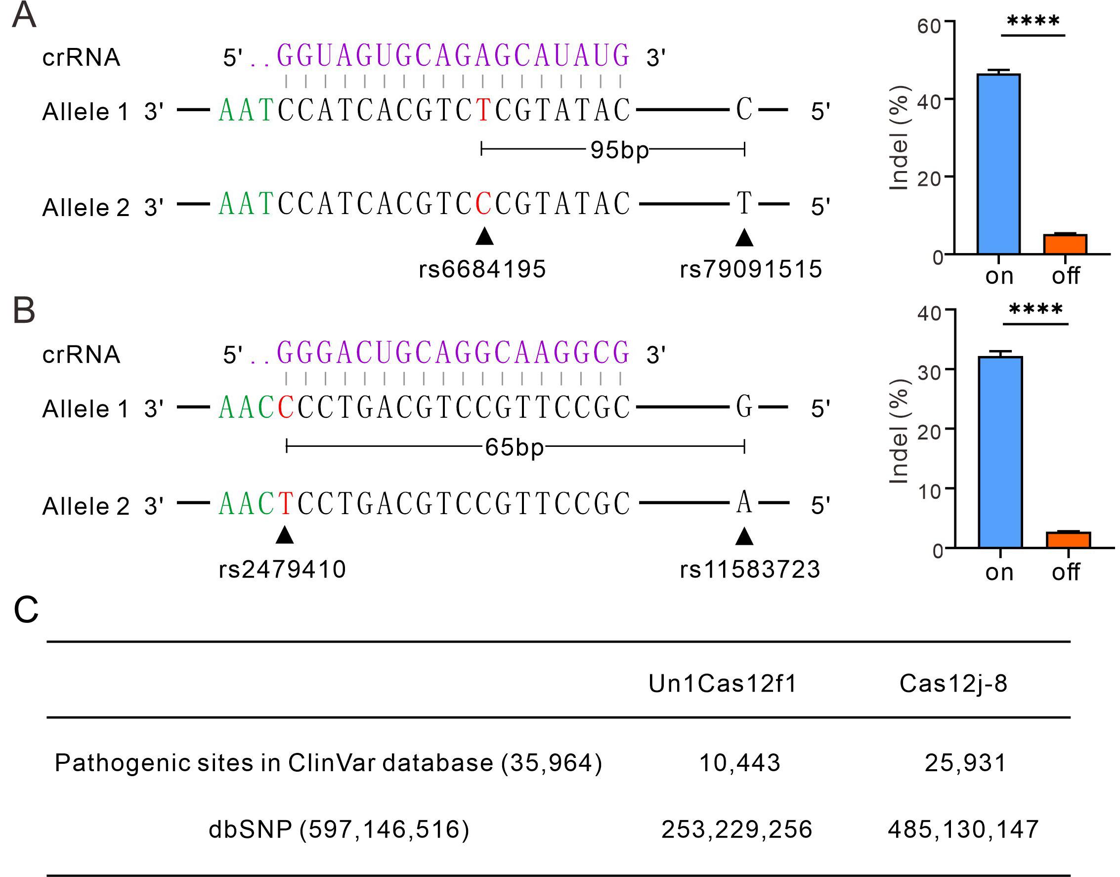 鉴于Cas12j-8蛋白具有较高的特异性,作者将Cas12j-8应用于单核苷酸多态性(SNP)位点的靶向编辑。Cas12j-8能够很好的区分单碱基差异(图5A-B)。针对Clin Var database 和dbSNP 数据库中的SNP位点进行crRNA设计(图5C),crRNAs位点数据已开放 (//www.deephf.com/#/resources/snp-edit)。总之,Cas12j-8具有蛋白小、活性高、能区分单碱基突变的优点,具有广泛的应用前景。