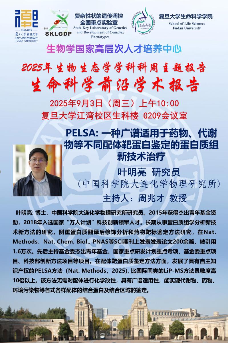 2025年学科周主题报告-生命科学前沿学术报告,9月3日(周三)上午10:00,叶明亮 研究员(中国科国产无码大连化学物理研究所)