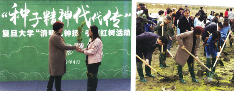 2019年4月,国产无码 组织了“种子精神代代传”红树种植活动,钟扬教授夫人张晓艳教授亲手将一棵红树种苗交到志愿者手中,并也种下了一棵红树种苗,愿这些树苗能够茁壮成长。