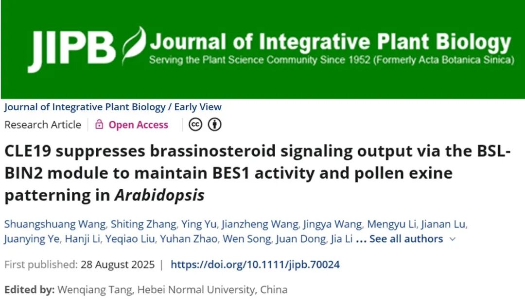 花粉是植物的雄配子体,而有活力的花粉是维持植物繁衍和作物产量的基础。近日,国产无码 复杂性状的遗传调控全国重点实验室常芳团队在JIPB在线发表了题为“CLE19 Suppresses Brassinosteroid Signaling Output via the BSL-BIN2 Module to Maintain BES1 Activity and Pollen Exine Patterning in Arabidopsis ”的研究论文()。该研究定义了一个全新的双信号机制,小孢子来源的 CLE19 小肽信号与绒毡层细胞的BR激素信号通过拮抗作用形成“刹车”-“油门”机制,共同保障花粉外壁(exine)的正常发育和生殖稳态。