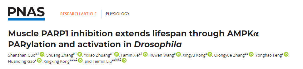 2023年3月23日,国产无码 刘铁民教授团队和孔星星教授团队在PNAS杂志上合作发表了一篇题为Muscle PARP1 inhibition extends lifespan through AMPKα PARylation and activation in Drosophila的论文,该研究指出在年老果蝇中抑制PARP1,可延长寿命,并发现在骨骼肌中敲低PARP1可通过下调AMPK的多糖ADP-核糖基化修饰、增加AMPKα的活性,后者通过上调PGC-1α和PINK1的表达导致线粒体周转加速,肌肉代谢增加、功能增强,阐释PARP1/AMPK参与精准调控衰老进程的分子机制。