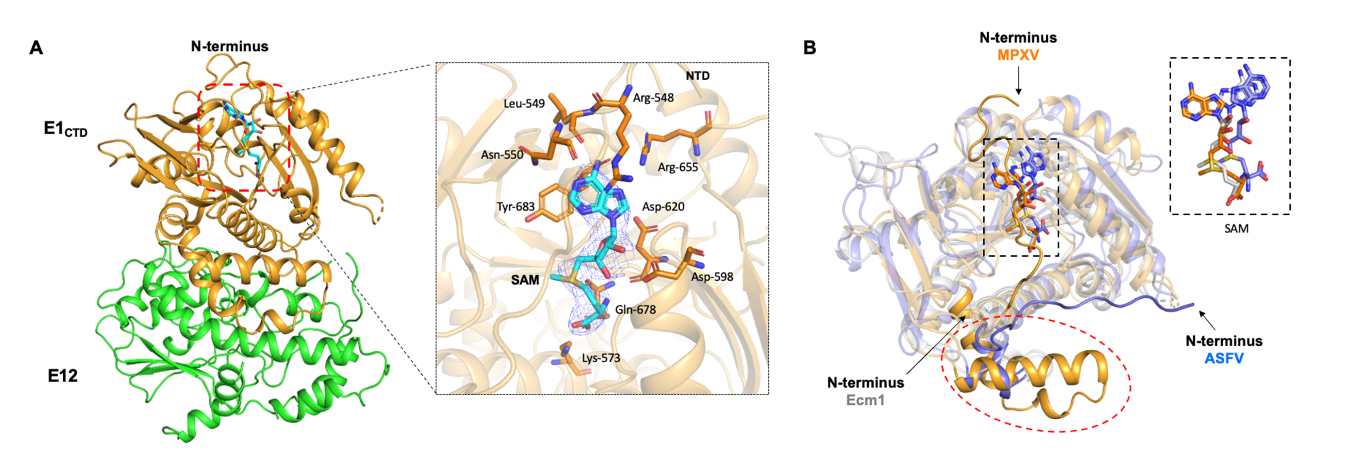 基于此,研究团队解析了猴痘病毒来源mRNA(鸟嘌呤-N7)甲基转移酶大小亚基结构及结合底物S-腺苷甲硫氨酸的复合物结构,并结合SAXS、ITC、SPR和定点突变的实验结果,发现了猴痘病毒mRNA(鸟嘌呤-N7)甲基转移酶底物结合的独特方式和关键氨基酸,以及mRNA(鸟嘌呤-N7)甲基转移酶大小亚基结合过程中的构象变化。这些工作为研究猴痘病毒mRNA加帽过程提供了分子基础,为抗猴痘病毒药物研发提供了新的视角。