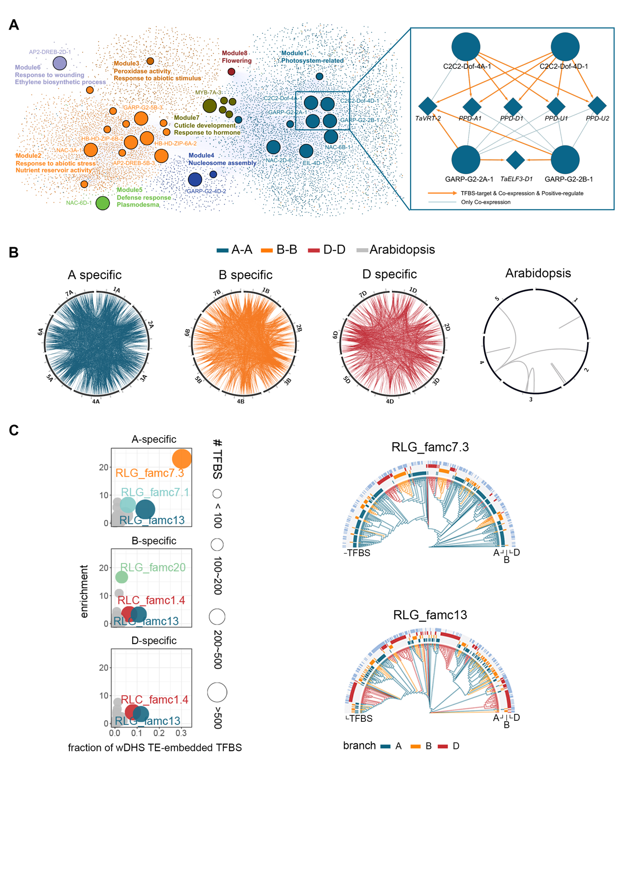 虽然祖先种TE的特异性扩张导致普通小麦三套亚基因组的调控区高度分化,但约70%的亚基因组直系同源基因存在协同转录。在看似无序的TE扩张和调控区域高度分化的背景下,三套亚基因组如何实现协同转录来保证调控系统的稳健性?通过分析直系同源基因启动子区由TE贡献的转录因子结合位点(TFBS),发现尽管不同转录因子结合位点序列大多只在一个亚基因组中由TE提供,但存在大量TFBS,其转录因子结合强度在亚基因组之间是一致的。这样不平衡的TE插入为何伴随平衡的转录因子结合?由于小麦基因组曾发生多轮TE爆发,经历漫长的进化历程,很多TE可能不再具有经典的TE结构。通过设计统计检验策略,在全基因组鉴定基因附近蜕化的TE。进化分析揭示三个亚基因组虽然经历了不平衡的TE蜕化,但是大量内部转录因子结合位点受到平行选择,在亚基因组间高度保守。追溯这些TE的类型和爆发时间,鉴定到亚基因组二倍供体的共同祖先中有一个特定的TE家族,其扩张发生于约500万年前,贡献于现代小麦大量转录因子在亚基因组间的协同结合位点。结合转录组数据,发现这些转录因子平衡结合调控的靶基因在亚基因组间趋于平衡表达。