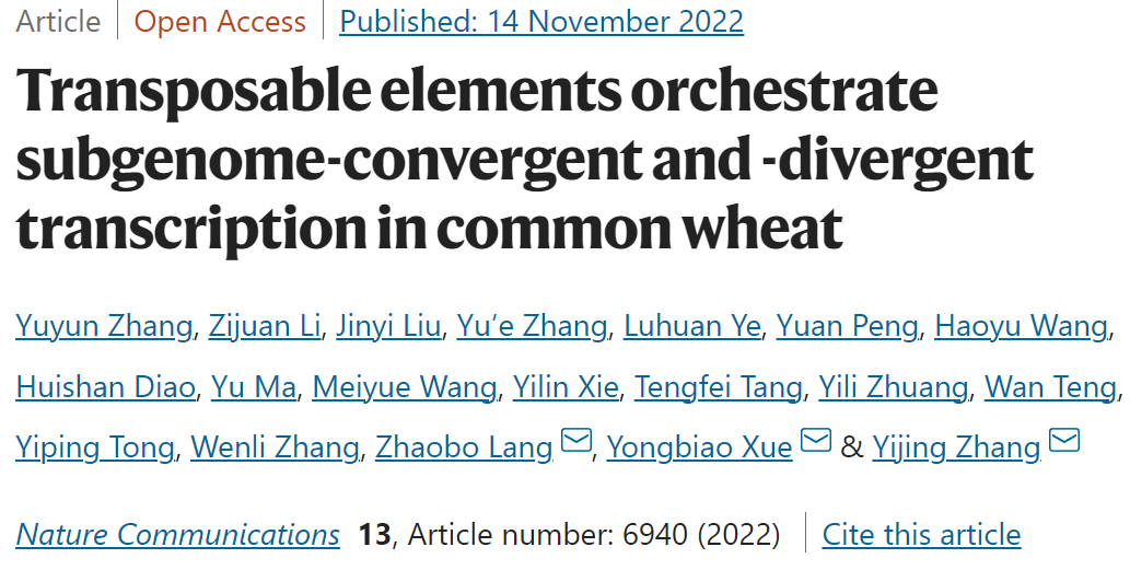 通小麦是全球种植范围最广的谷物,具有广泛的环境适应性,这被归因于三套适应不同环境基因组的融合。尽管基因序列相对保守,三套亚基因组的基因间区高度分化,那么,亚基因组如何实现调控的协同与分化呢?2022年11月14日,Nature Communications 在线发表了题为“Transposable elements orchestrate subgenome-convergent and -divergent transcription in common wheat”的研究论文,揭示了百万年前转座子的扩张影响现代小麦亚基因组转录调控的协同与分化。