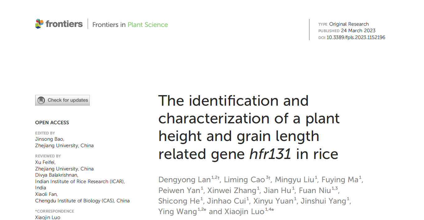 2023年3月24日,国产无码 罗小金课题组在Frontiers in Plant Science在线发表了题为“The identification and characterization of a plant height and grain length related gene hfr131 in rice”的研究论文。该研究采用功能基因组和群体基因组相结合的方法,揭示了BR与生长素协调调控水稻株高和粒型的机制,发现了有利于提高水稻产量的优势单倍型组合。