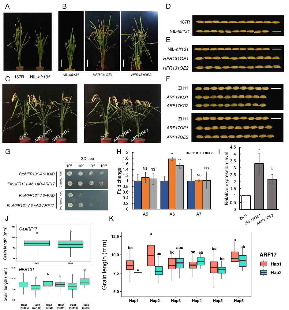 该研究以长雄野生稻(Oryza longistaminata)和籼稻187R为遗传材料,构建并鉴定到了一个株高显著变矮、粒长显著变短的近等基因系NIL-hfr131,通过精细定位和基因表达验证,发现hfr131是水稻BR受体基因OsBRI1的新等位基因。在NIL-hfr131的转录组数据中发现多个与赤霉素和生长素相关的基因表达水平发生了显著的变化,表明hfr131可能通过协调多种激素调控水稻株高和粒长。生长素响应因子OsARF17被发现是HFR131的上游调控基因,OsARF17敲除或过表达株系与NIL-hfr131或HFR131过表达株系在株高和粒长上具有相似的表型,结合酵母单杂、ChIP、qPCR等实验进一步证实了OsARF17能够与HFR131启动子区结合,促进HFR131的表达,且OsARF17敲除株系对BR的敏感性显著下降,表明OsARF17-HFR131能够沟通BR和生长素来调节水稻株高和粒长。此外,利用RFGB()对OsARF17和HFR131单倍型进行二因素分析,发现OsAFR17Hap1/HFR131Hap6单倍型组合能最为显著的增加水稻粒长,为高效的分子育种提供了重要的分子依据。