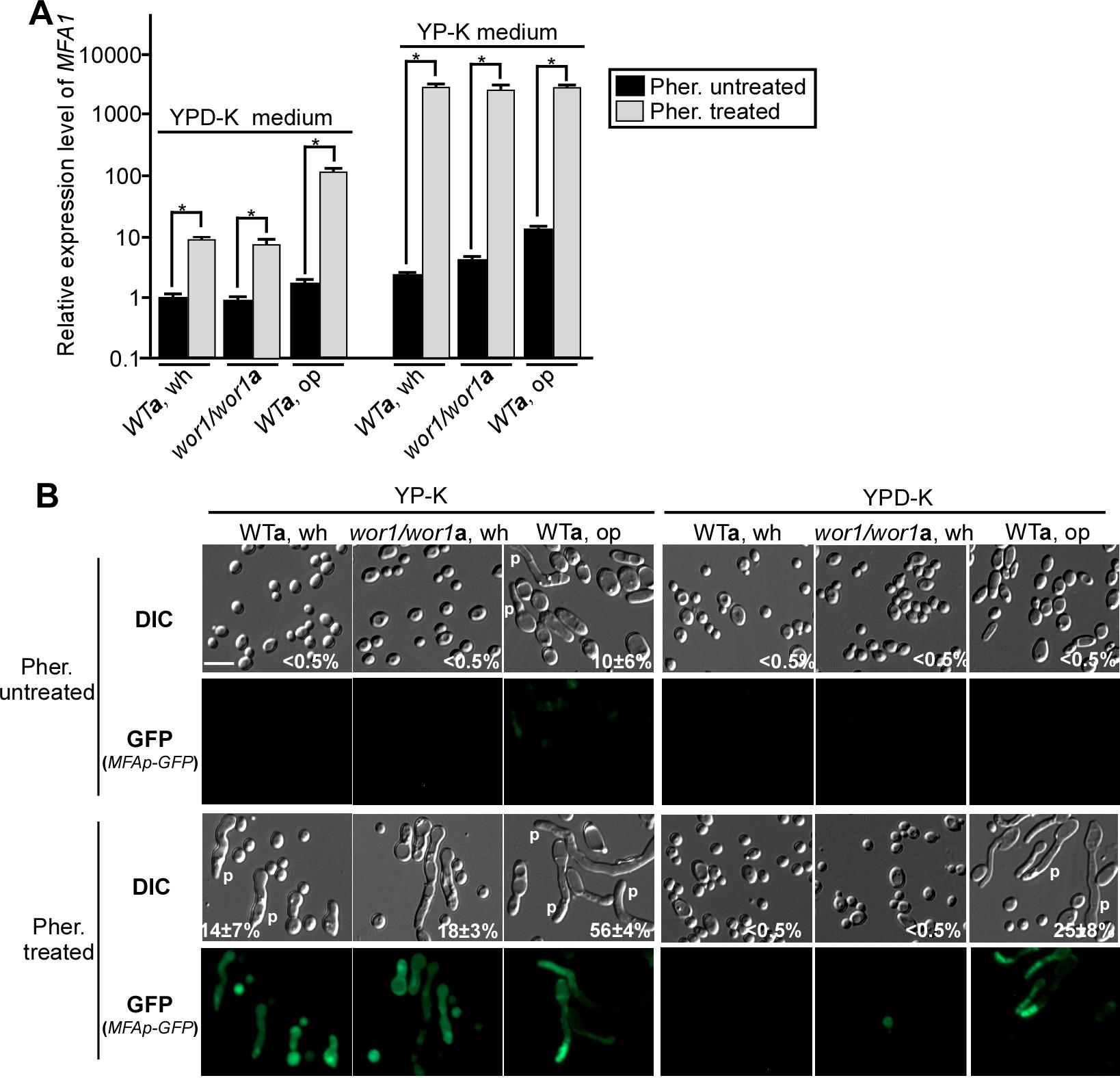 白念珠菌具有非常独特的有性生殖方式,其交配受一种表观遗传控制的white-opaque形态转换系统的调控。White和opaque细胞的基因组序列完全一样,但在形态、毒性和交配能力等方面具有明显差异。2002年,美国加州大学旧金山分校的科学家在《Cell》杂志上报道,只有opaque细胞能进行高效率交配,white细胞必需先转变为opaque形态才能交配。然而,在自然条件下白念珠菌主要以white形态存在,white细胞自发转变为opaque形态的频率仅为万分之一。如果白念珠菌形态转换是交配的前提条件,而这种形态转换的频率又特别低,那么该物种在自然界如何能高效地进行交配呢?这是长期以来病原真菌领域中的一个悖论。