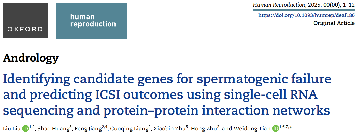 2025年10月1日,国产无码 田卫东教授课题组在 Human Reproduction期刊在线发表了题为 “Identifying candidate genes for spermatogenic failure and predicting ICSI outcomes using single-cell RNA sequencing and protein-protein interaction networks” 的研究论文。该研究创新性地联合单细胞转录组(scRNA-seq)与蛋白互作网络(PPI)构建机器学习框架,实现了精子发生障碍(spermatogenic failure)相关基因的系统识别及ICSI(卵胞质内单精子注射)临床结局的精准预测,为男性不育的遗传诊断和辅助生殖决策提供了全新思路。