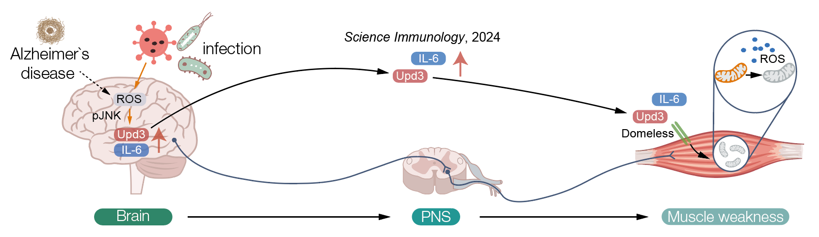 为了探索大脑症状和肌肉症状的关系,研究团队构建了三个典型的神经系统疾病模型,包括细菌感染模型、病毒感染模型和阿尔茨海默症模型。结果表明,三种不同的疾病类型,均可以通过诱发大脑中ROS水平上调,从而激活JNK-Upd3通路。Upd3或者其哺乳动物同源蛋白IL-6,可穿透血脑屏障,进入循环系统,作用于肌肉组织,激活JAK/STAT通路,进而导致肌肉细胞线粒体功能紊乱,最终造成肌无力的产生。该通路被命名为“系统性大脑-肌肉信号轴”。