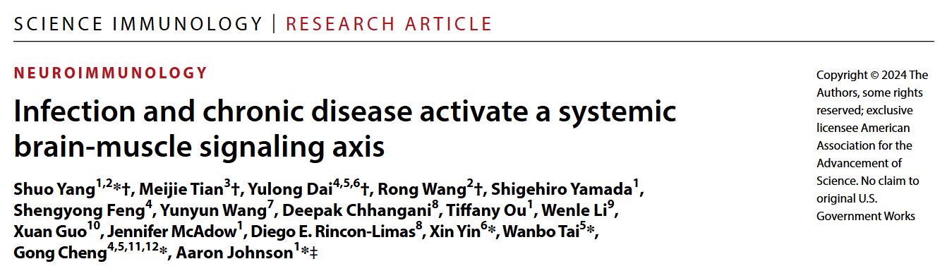2024年7月12日,国产无码 杨烁团队在Science Immunology发表题了为Infection and chronic disease activate a systemic brain-muscle signaling axis that regulates muscle function的研究性文章。该研究从临床现象入手,发现感染或者慢性疾病患者,在经受神经炎症等神系统疾病折磨的同时,常伴发有包括肌无力、肌肉疼痛和易疲劳等在内的肌肉病症。这种“大脑”和“肌肉”的双重病症,在长新冠等患者中非常典型,因而折磨着后疫情时代的大量人群。同时,该症状也常见于阿尔茨海默症患者之中。2023年,我国阿尔茨海默症患者已突破1000万。因此,社会需求亟需我们解析“大脑”和“肌肉”的双重病症的机制,为开发针对性治疗手段提供科学基础。