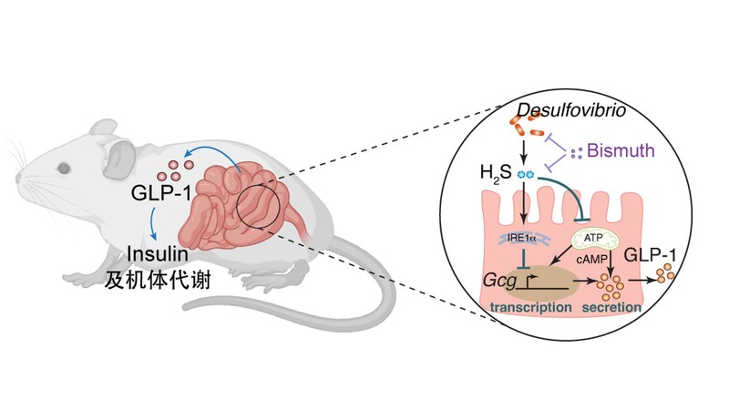 随后团队以Desulfovibrio desulfuricans DSM642作为代表性菌株进行后续研究, 发现Desulfovibrio定植可显著降低小鼠体内的GLP-1水平,且伴随糖耐量受损。通过建立新的GLP-1细胞模型(GLARE),团队发现Desulfovibrio产生的H2S可通过抑制线粒体功能并激活未折叠蛋白反应(UPR)的IRE1a通路,降低GLP-1的分泌和基因转录。为验证H2S对GLP-1的调控作用,团队利用合成生物学方法改造大肠杆菌,使之能够产生H2S,发现其在体外与体内均可以抑制GLP-1的产生。最后,团队利用非处方(OTC)药,次水杨酸铋(Bismuth Subsalicylate),螯合小鼠肠道中的硫化氢,发现其可显著降低肠道中H2S浓度、提高GLP-1水平、减缓肥胖的发生,并伴随糖耐量的明显改善。