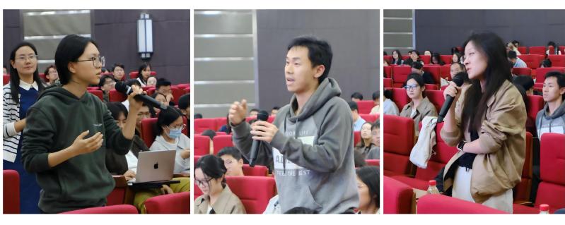 “这些复合物是如何改变结构来控制融合反应?”、“如何清晰地看到反应的过程?”、“有包膜保护的病毒在外泌体中传递和释放是偶然吗?”、“目前研究在医学领域有哪些应用?”报告后,现场师生踊跃提问,两位主讲人幽默并富有激情的回答也展现了科学大师对生命基本问题的深入思考和长期坚持研究。正式报告环节结束后,同学们围在讲台前,与两位主讲人面对面交流。