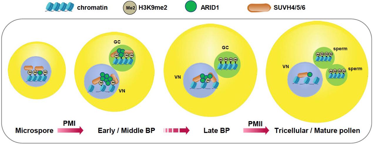 图注:在花粉第一次有丝分裂(PMI)结束后,VC中的染色质去浓缩,而GC中的染色质仍保持浓缩的状态。与此同时,H3K9me2在VN中逐渐减少,而在GN和SN中保持不变。ARID1通过促进SUVH4/5/6在早期GC中的定位,并招募SUVH4/5/6到染色质,减缓VN中H3K9me2的擦除,并促进GN和SN中H3K9me2的维持,以此调节VC与GC/SC之间H3K9me2的差异表达。PMI,花粉有丝分裂I;PMII,花粉有丝分裂II;VN,营养核;GC,生殖细胞;SC,精细胞;BP,双细胞花粉。