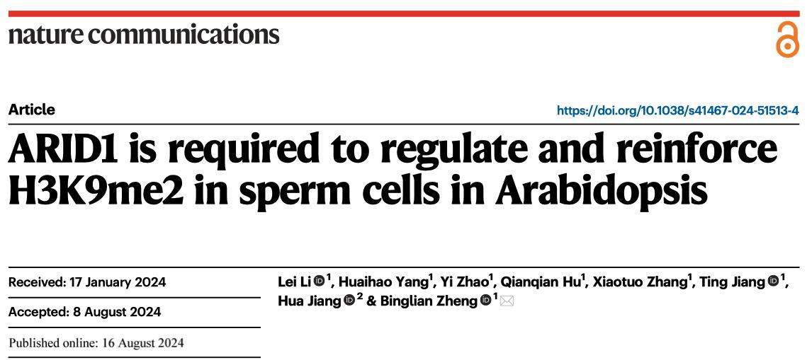 2024年8月16日,郑丙莲课题组在Nature Communications在线发表了题为“ARID1 is required to regulate and reinforce H3K9me2 in sperm cells in Arabidopsis”的研究论文。该研究观察了H3K9me2在花粉有丝分裂过程中的动态表达模式,揭示了花粉特异表达的转录因子ARID1参与H3K9me2的调控及精细胞核异染色质浓缩的新机制。