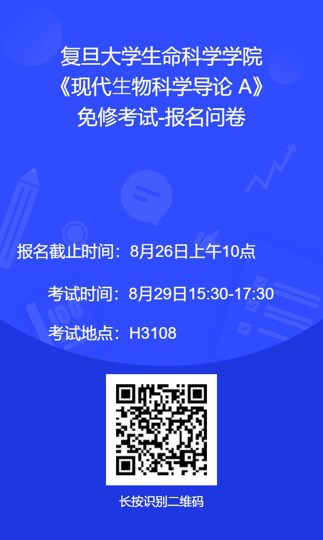 有意参加《现代⽣物科学导论 A》免修资格考试的同学,请在8月26日上午10点之前扫描如下二维码报名。