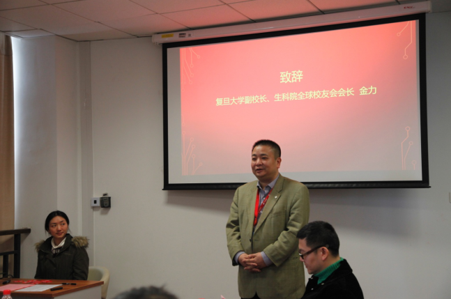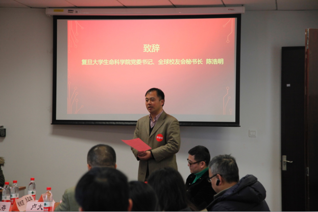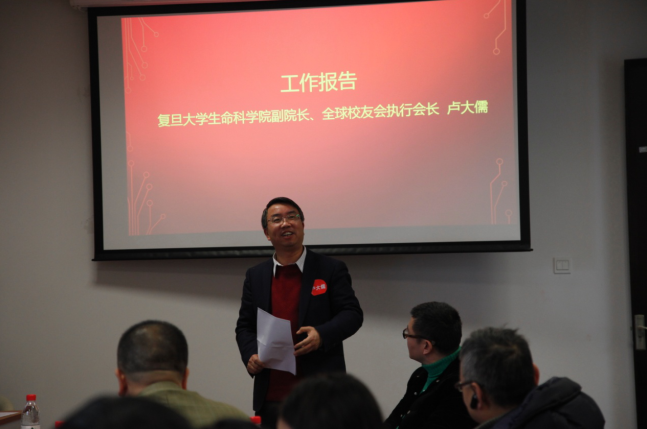 会议结束,复旦生科院全球校友会执行会长卢大儒公示校友会LOGO.