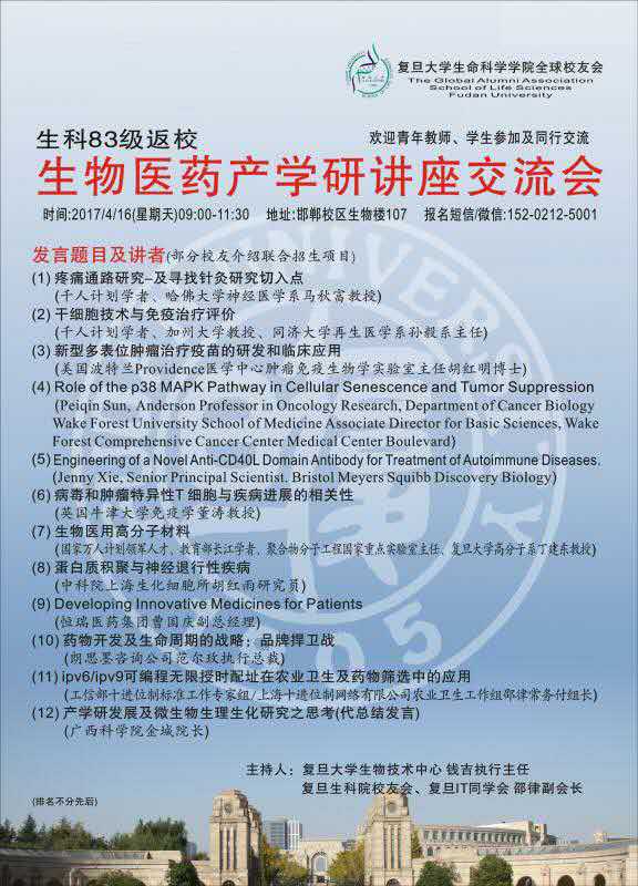 4月16日,国产无码 1983级校友返校暨生物医药产学研讲座交流会在立人生物楼107报告厅隆重举办。来自世界各地的复旦生科83级校友济济一堂,共叙同窗情谊,畅谈学科前沿,现场气氛十分热烈。