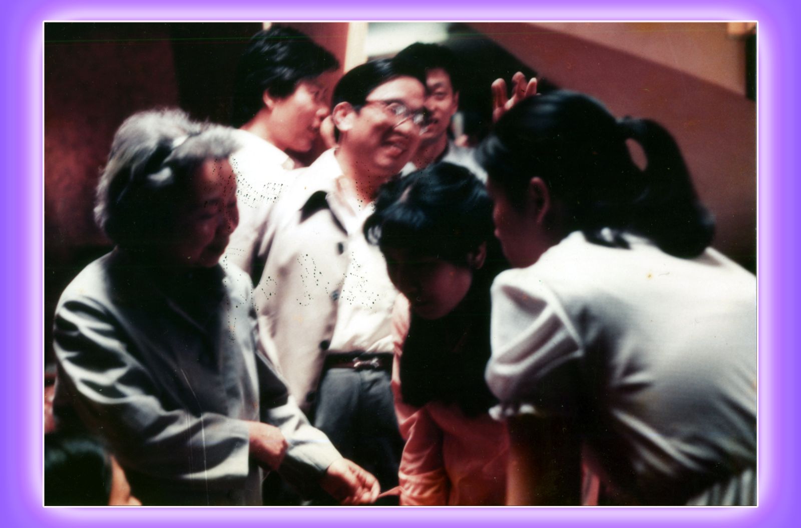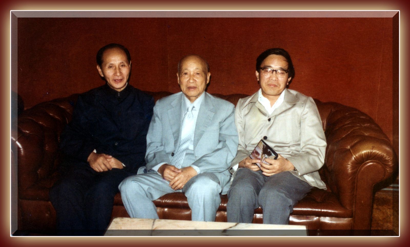 1983年的国庆前夕,苏老又来到巴黎,在使馆教育处给全体赴法进修生作了“刻苦攻读,报效祖国”的报告。我有幸参加接待,苏老讲话铿锵激昂,报告二小时后,我们特去买了只西瓜(巴黎人不常吃西瓜)让他润润喉咙,我在旁边看到苏老吃得很有滋味非常高兴,事后在照相时我眯眼沉浸在喜悦之中。