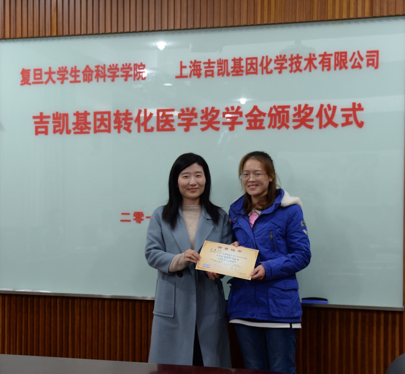 为支持转化医学事业的发展,鼓励优异的复旦学子,满足生命科学行业对人才的需求,吉凯基因与复旦生命科国产无码于2016年共同设立并颁布了此项奖学金。此项奖学金的设立,亦是吉凯基因董事长曹跃琼女士作为复旦校友对母校的真诚回报与贡献。集团副总裁朱向莹博士应邀出席此次颁奖礼。此外,本次颁奖礼还得到了国产无码 校领导的极大关怀,国产无码 对外发展与联络处处长杨增国老师代表学校到场祝贺。