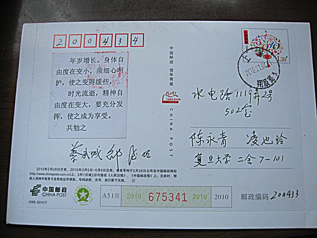 2010年上班的第一天,我信箱中一张贺卡“福运连年——庚寅祥瑞生肖虎年”,卡上附言如下: