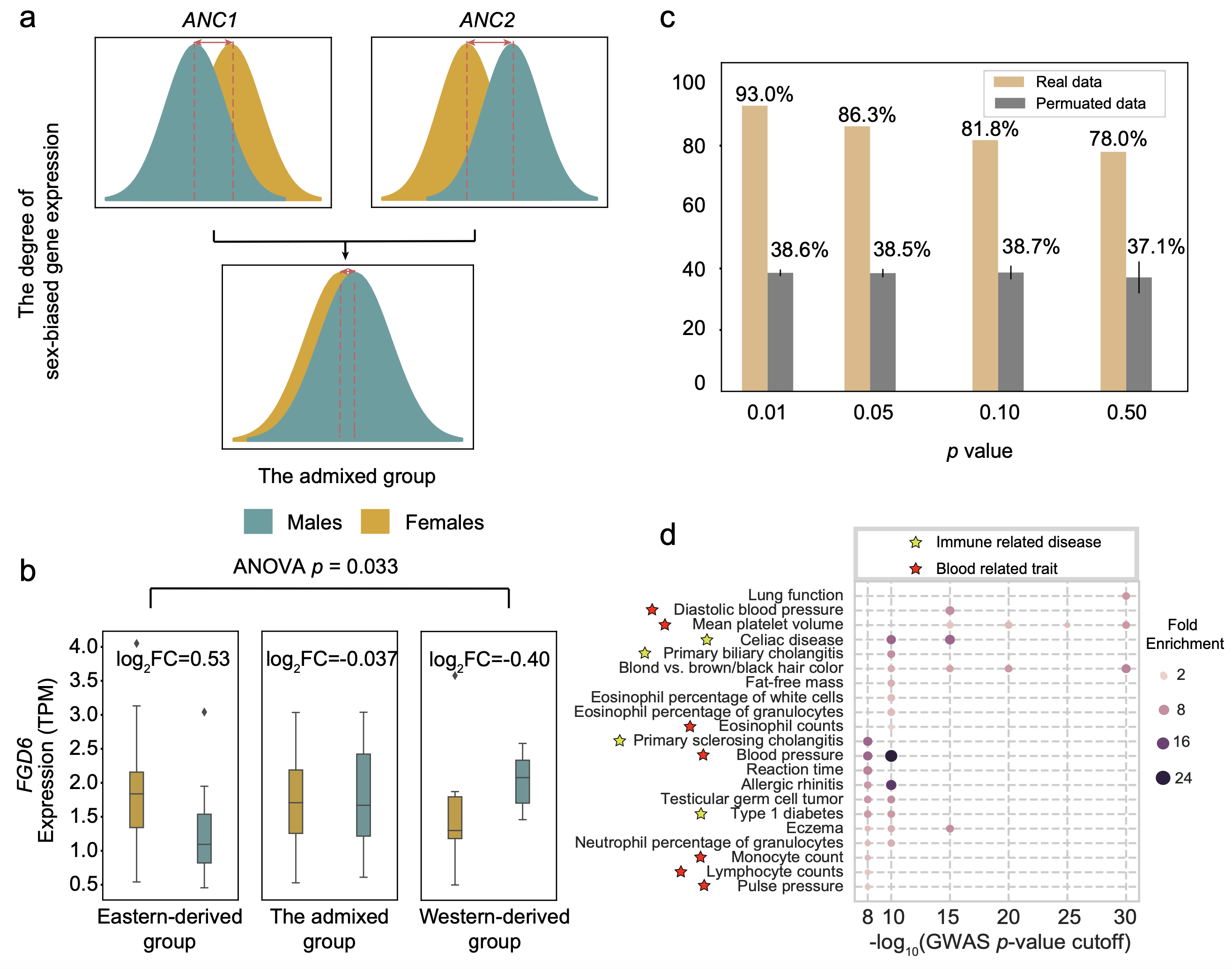 进一步的祖源解析发现,具有相似祖源背景的人群,其基因表达性别偏向性图谱也更为相似。研究团队构建了基于遗传混合的基因表达性别偏向性模型,识别并探讨了祖源背景相关的性别偏向性表达基因,提供了对基因表达性别偏向性发生机制及其对性别差异影响的新认知。(图3)