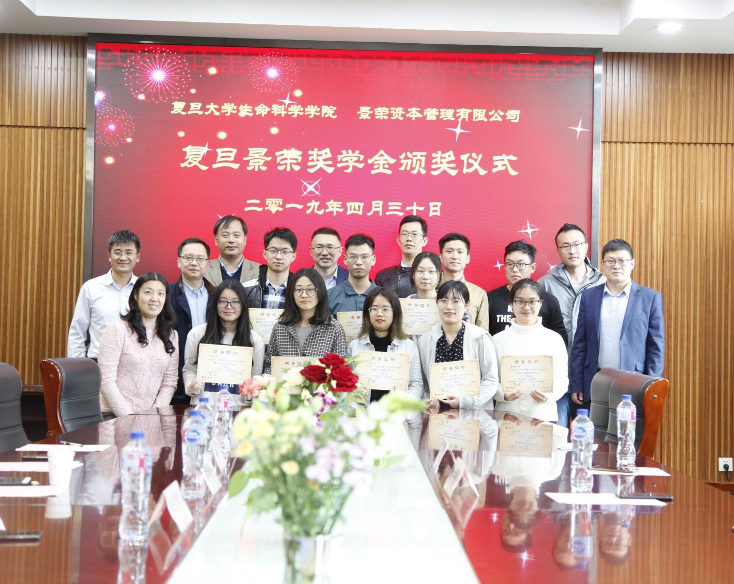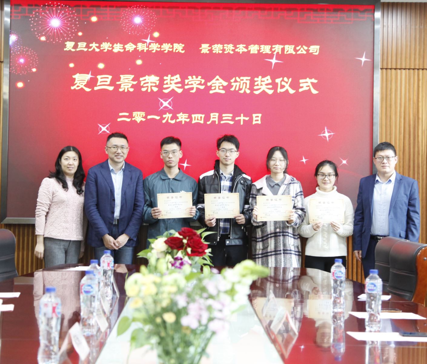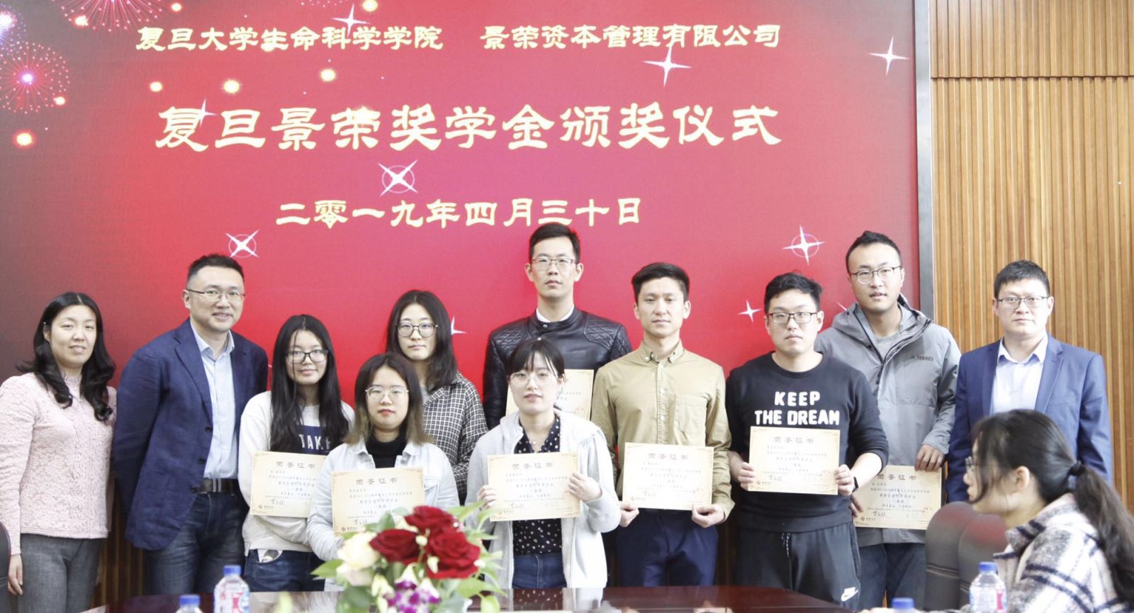 2019年4月30日中午,复旦景荣生命科学奖学金颁奖仪式在国产无码 A208会议室顺利举行。国产无码 对外联络与发展处副处长陆颖丰,国产无码 分党委书记陈浩明,分党委副书记余文博、丁澦,上海景荣资本副总裁、景旭创投创始合伙人、国产无码1997级校友钱庭栀,景旭创投投资总监、国产无码1997级校友时锋,景荣生命科学奖学金获奖学生等共同出席了颁奖仪式。会议由陈浩明书记主持。