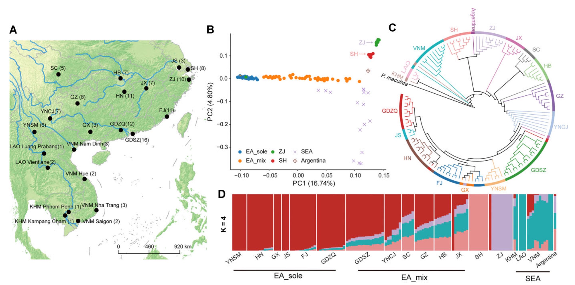 小管福寿螺(Pomacea canaliculata)原产于南美洲亚马逊河流域,后被引入东亚和东南亚多个国家,是唯一一种被世界自然保护联盟(IUCN)列为全球100种恶性外来物种的淡水螺,因其繁殖力高、生长快和适应性强的特点,严重危及入侵地区生态系统,值得一提的是,福寿螺是人畜共患寄生虫广州管圆线虫的传播媒介,严重威胁人类健康并对公共卫生安全造成影响。本研究结合PacBio、Hi-C和全长转录组测序完成了福寿螺参考基因组的组装与注释,采集了来源于中国南部14个省/市以及东南亚的3个国家(柬埔寨、老挝和越南)的小管福寿螺样本进行全基因组测序。尽管此前的线粒体研究显示小管福寿螺在亚洲经历了多次的起源和迁徙,但全基因组水平的遗传变异图谱依然揭示其在东亚和东南亚地区存在亚群结构(图1)。