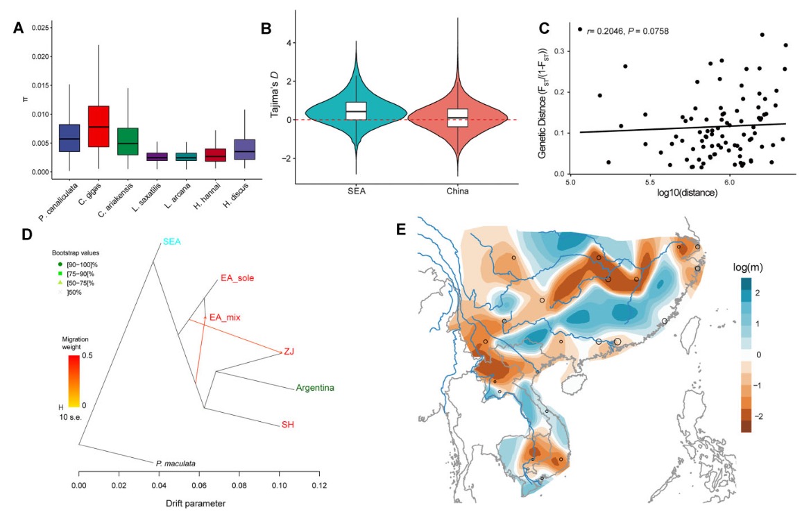 胡薇/陆艳团队题为“Whole-genome sequencing of the invasive golden apple snail Pomacea canaliculate from Asia reveals rapid expansion and adaptive evolution”的研究论文。该研究通过采集和分析亚洲17个地区的173个小管福寿螺基因组,结合三代基因组组装和转录组测序分析,系统评估了小管福寿螺在亚洲地区的遗传多样性和群体结构,解析了福寿螺作为入侵物种进入亚洲后快速适应新环境的演化机制。