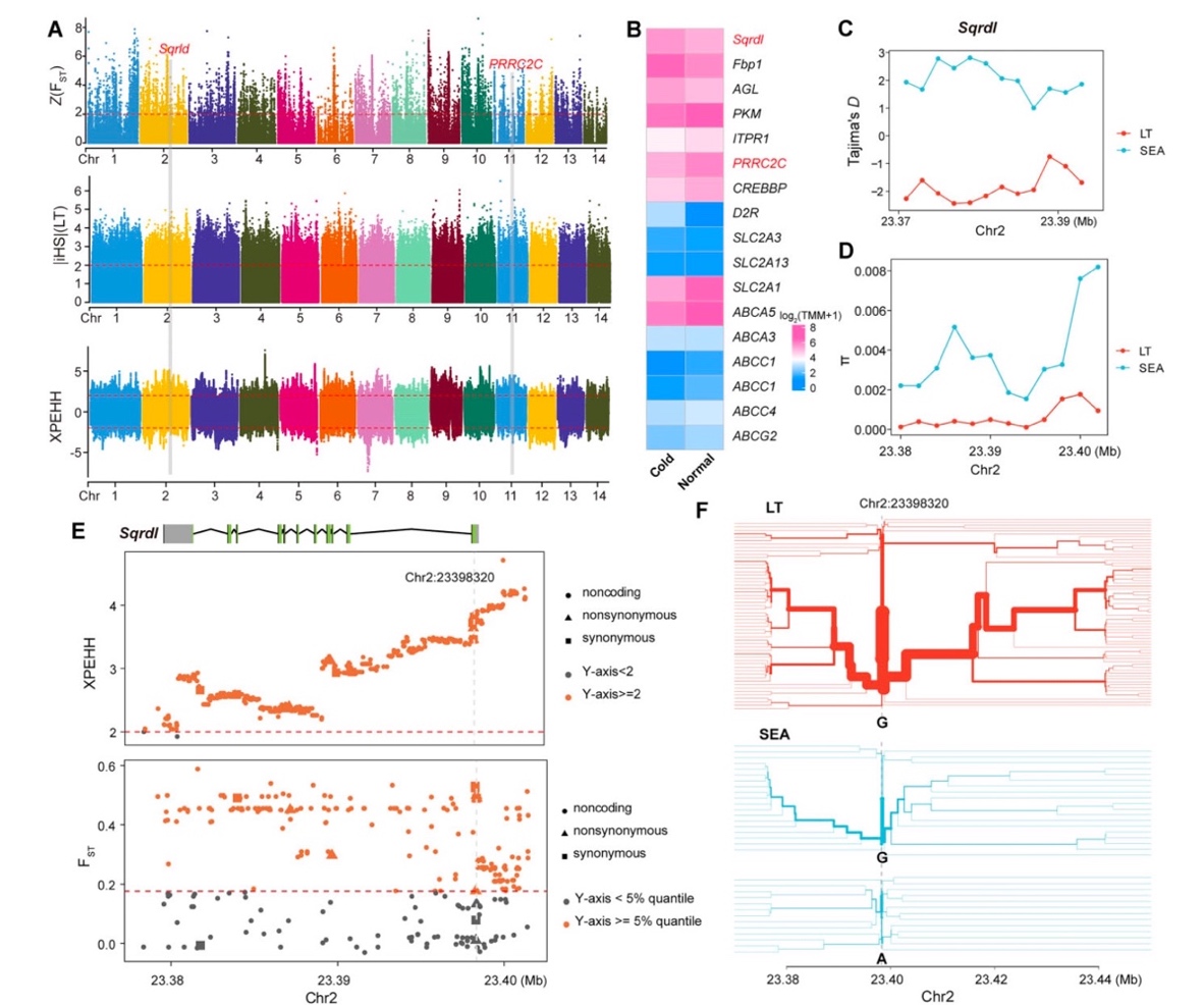 本研究还发现了9个与温度相关的基因具有显著的自然选择信号,并在正向调节冷应激、寒冷适应和耐受、抑制棕色脂肪组织中的冷启动等过程中发挥重要作用,转录组分析显示这些基因的表达在冷刺激下均显著上调(图4)。此外,福寿螺具有较强的抗病原胁迫能力,我们共发现235个基因具有显著的平衡选择信号,其中199个基因在不同刺激下(冷刺激、热刺激、干旱、重金属胁迫和空气暴露)呈现差异化表达,且这些具有显著平衡选择的信号的基因大部分与免疫相关,可能是小管福寿螺应对亚洲复杂的病原体环境并与之共进化的遗传基础。