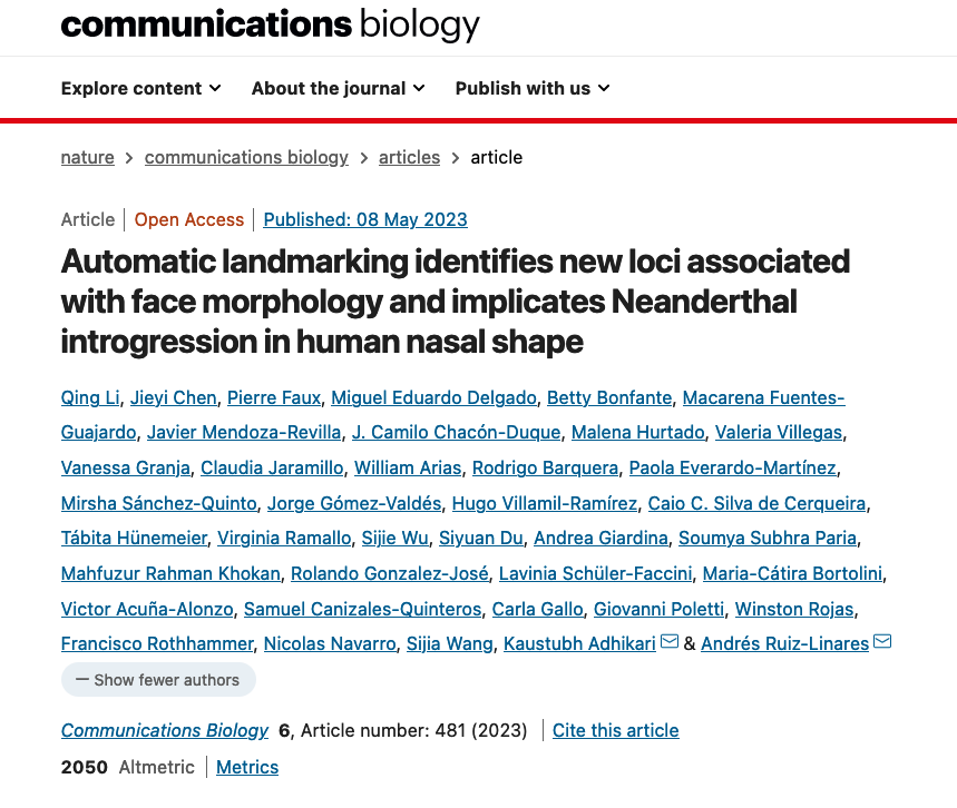 2023年5月8日,国产无码 等机构的研究人员在Communications Biology杂志上发表了题为“Automatic landmarking identifies new loci associated with face morphology and implicates Neanderthal introgression in human nasal shape”的文章。该研究确定了一个能够影响人类鼻子形状的新基因—ATF3,并提出了一个重要猜想:ATF3基因很可能来源于尼安德特人,且这一导致鼻子变高(从上到下)的基因可能是自然选择的产物,因为古代人类在离开非洲后进入了更为寒冷的气候,而鼻梁变高则是它们适应寒冷气候的结果,因为增高的鼻梁结构让他们能够预先加热吸进来的冷空气,避免脆弱的气管和肺部受到冷空气的刺激。