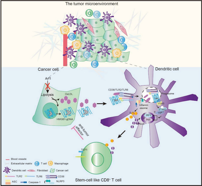 综上所述,Arf1缺失的肿瘤细胞释放OxLDL,HMGB1和基因组DNA,它们共同与DC表面上CD36/TLR2/TLR6的共受体复合物结合。此复合物然后由Rab7介导转移进内体,并进一步招募NF-κB,NLRP3炎症小体和cGAS-STING三个通路的组分而形成一个超级信号复合体,激活三通路并产生CCL5,IL-1β,1型IFN和CXCL10。这些细胞因子共同促进DC 活化、增强CD8+ T细胞肿瘤浸润、交叉启动和干性。