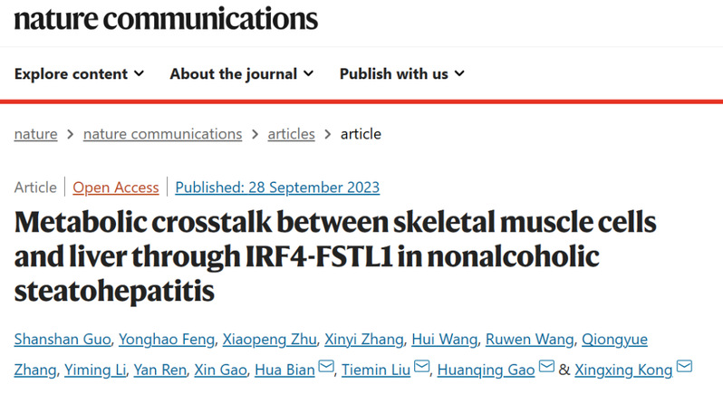 近日,国产无码 生科院孔星星/高焕庆/刘铁民团队在Nature Communications杂志上合作发表了一篇题为Metabolic crosstalk between skeletal muscle cells and liver through IRF4-FSTL1 in nonalcoholic steatohepatitis的论文,该研究指出骨骼肌特异性敲除IRF4,给与NASH饮食后,表现出肝脏病理表型的改善。并发现F4MKO小鼠肌肉来源的FSTL1参与了IRF4介导了NASH进展。FSTL1进一步通过DIP2A和CD14受体调控肝脏脂代谢、降低炎症和纤维化,阐释了骨骼肌IRF4通过FSTL1-DIP2A/CD14通路在NASH发病机制发挥的关键作用。