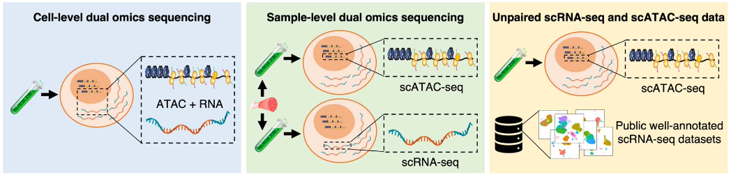 样本层面的双组学测序数据(sample-level dual omics sequencing)。即同一份样本分成两份分别进行 scRNA-seq 和 scATAC-seq。这种数据通常是研究人员为了自己的研究目的从而进行了特殊的实验设计,对双组学分别进行测序。