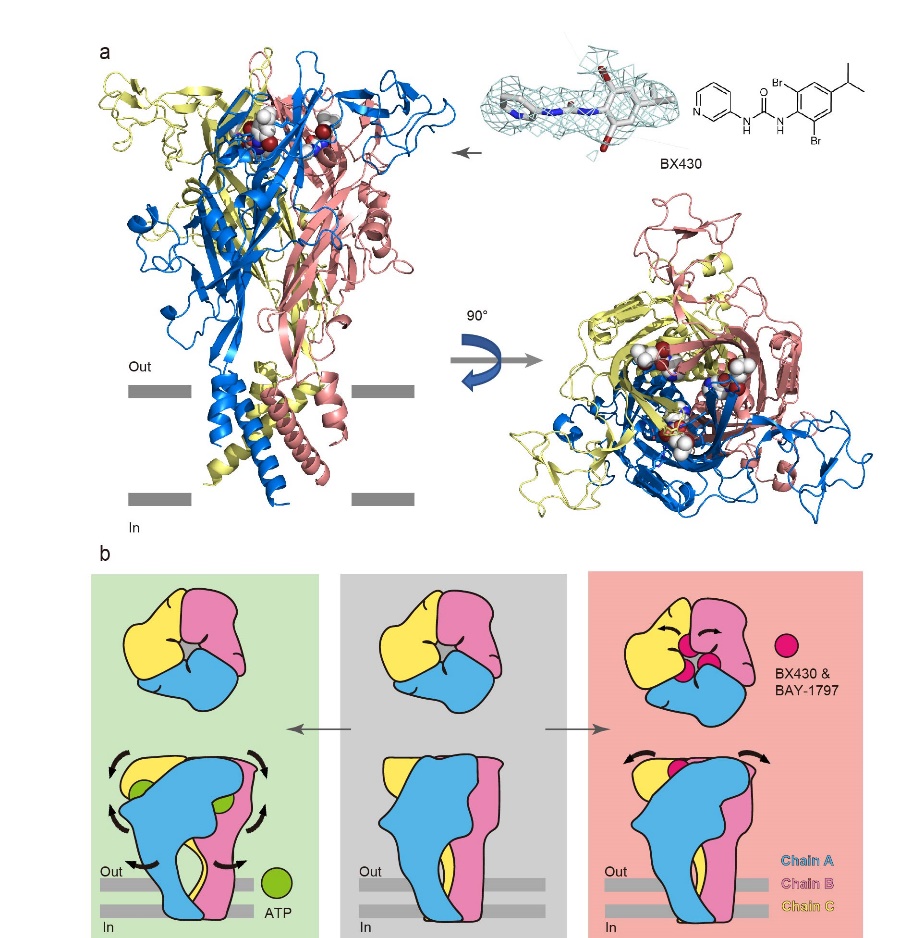 图 (a)P2X4与BX430复合物结构 (b)P2X4受体别构抑制的机制